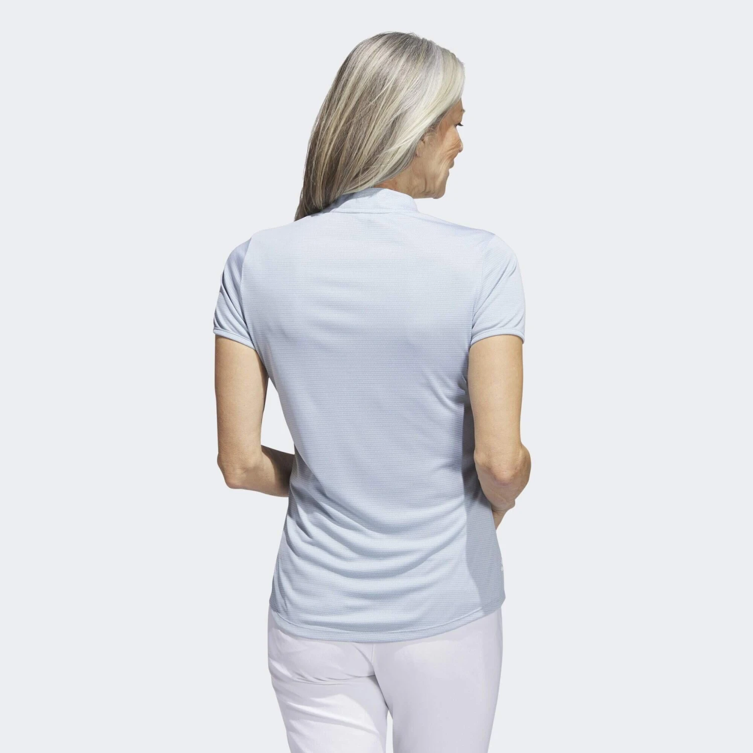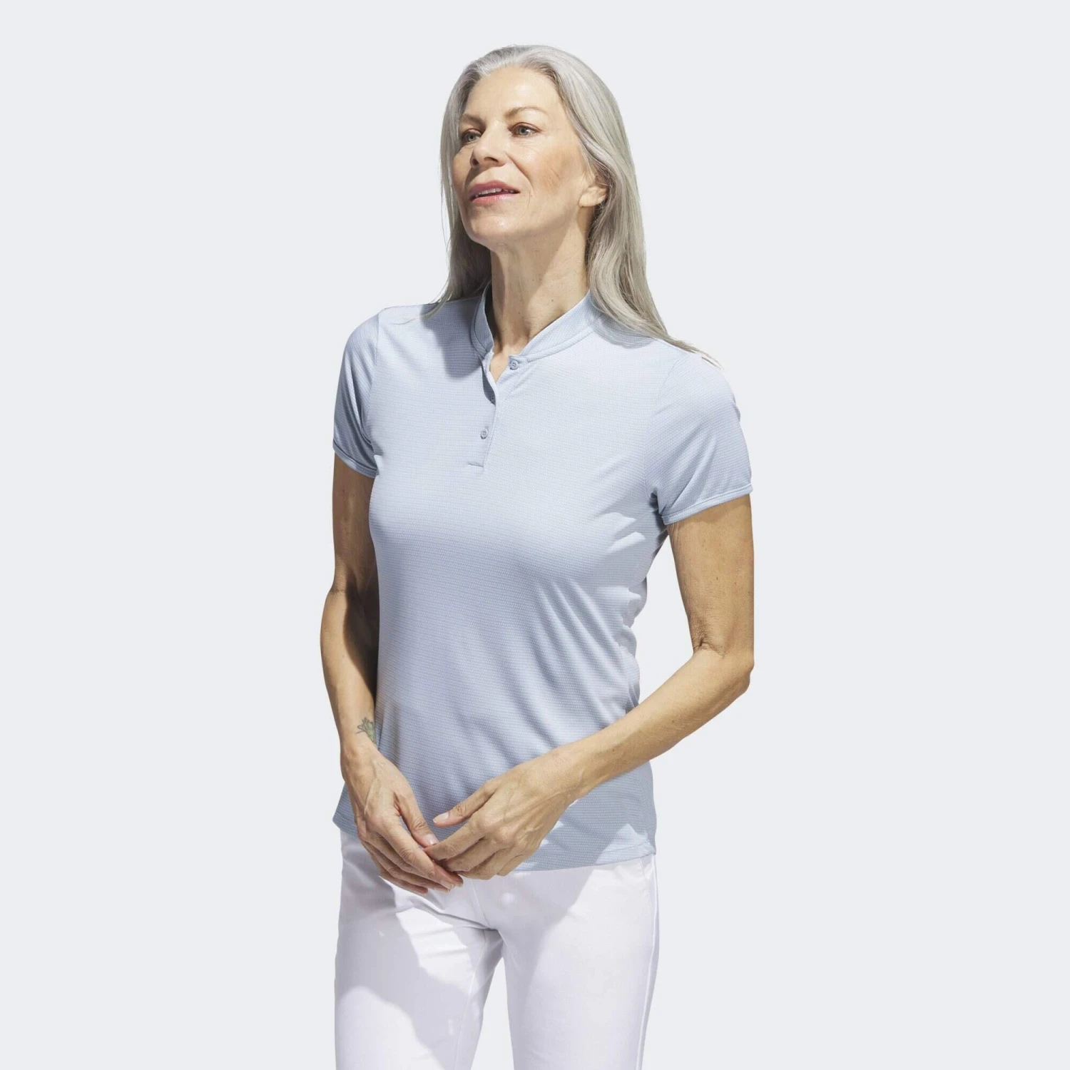 Step onto the course in sporty style. This adidas golf polo shirt offers a fresh look for your round with an allover dot print and easygoing henley collar. Soft doubleknit fabric keeps you comfortable through every swing. A curved hem finishes off the modern look with a feminine touch. Made with 100% recycled materials, this product represents just one of adidas’ solutions to help end plastic waste.