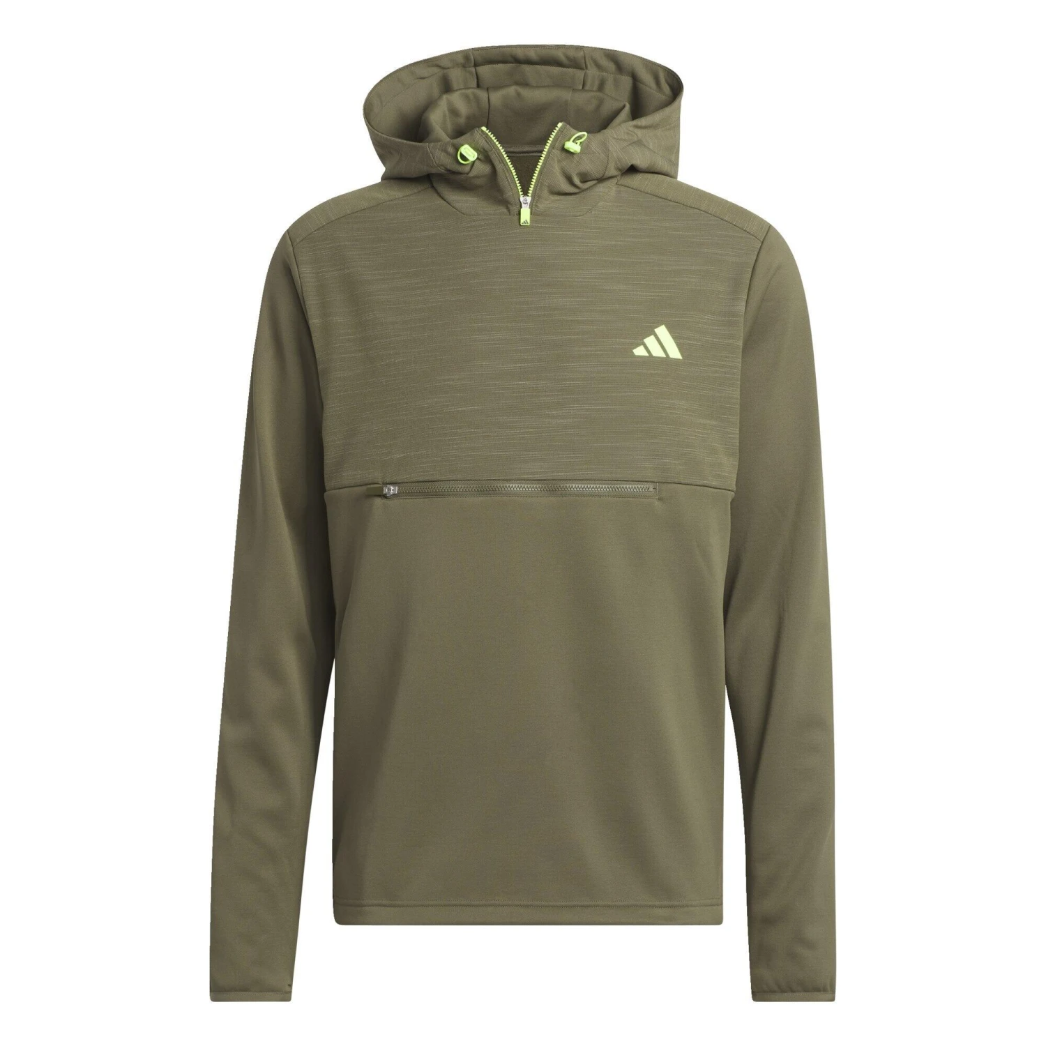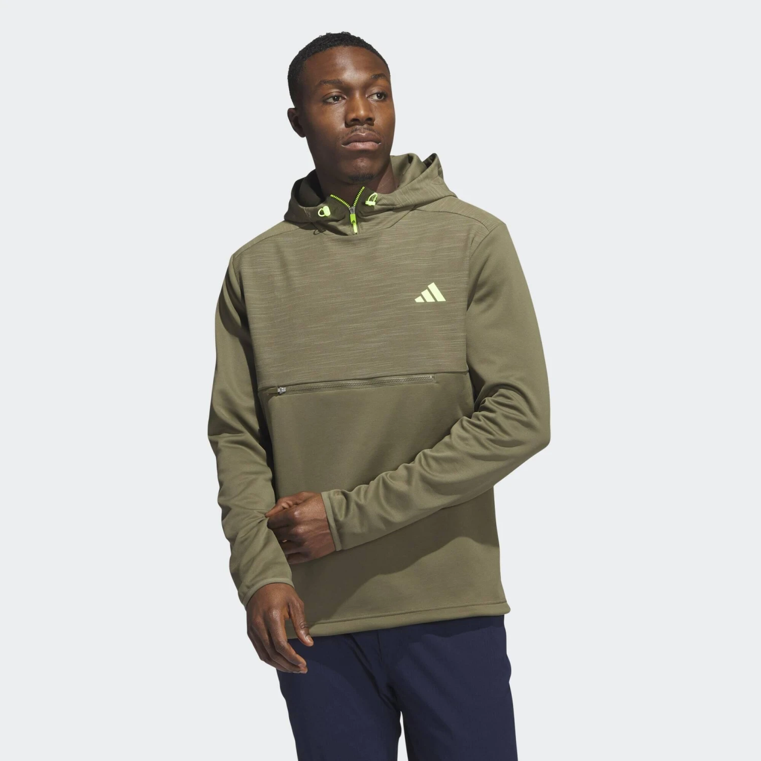 Stay on par during cool-weather rounds in this adidas golf anorak. Soft fleece keeps you warm and cosy through 18 holes, and a water-repellent finish sheds light rain so you stay dry through your final putt. A hood with a small front zip adds extra protection when you need it. Stash your scorecard in the centre-front zip pocket for easy access and play through.Made with a series of recycled materials, and at least 70% recycled content, this product represents just one of adidas’ solutions to help end plastic waste.