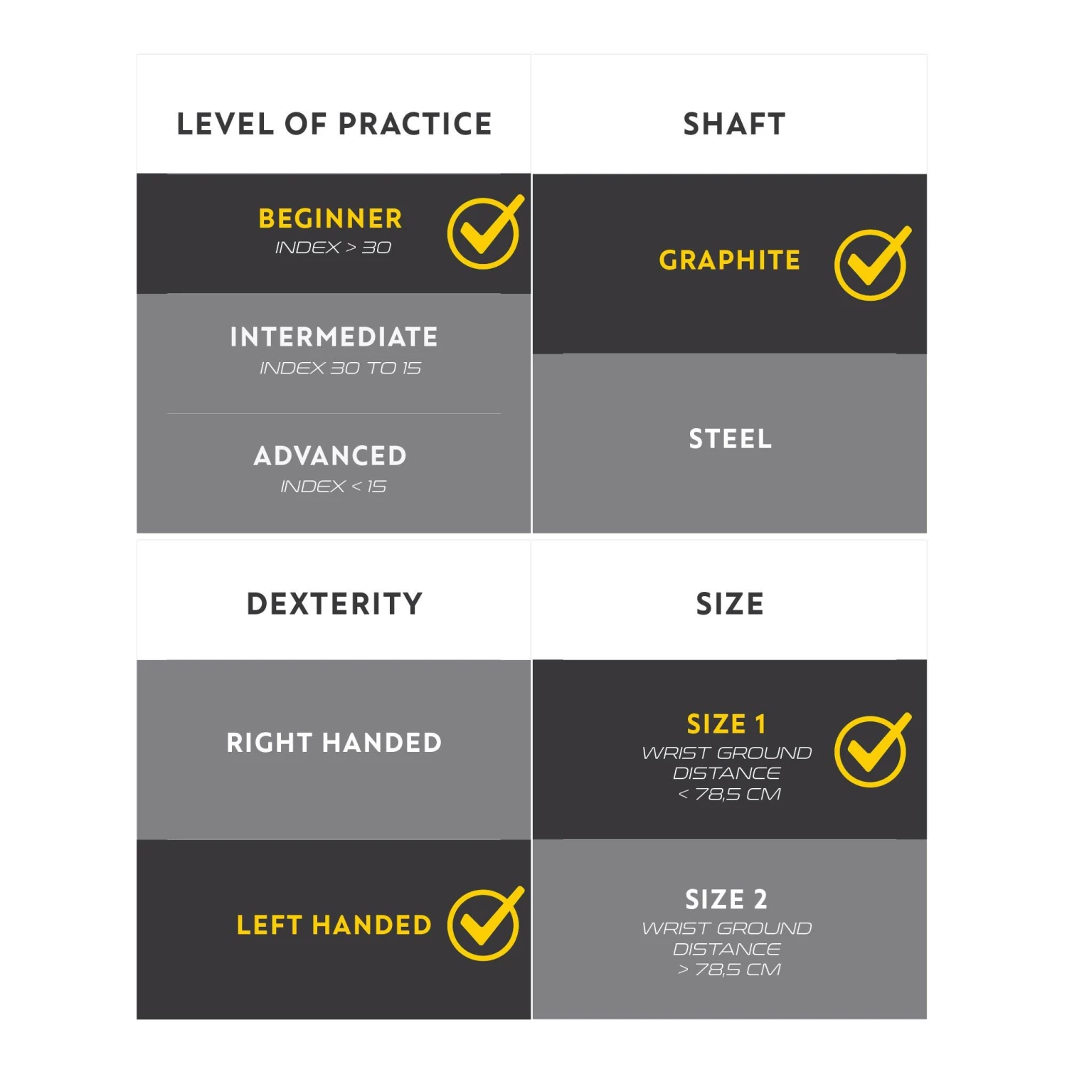 SIZE 1: suitable for players with a ground to wrist distance less than 78.5 cm