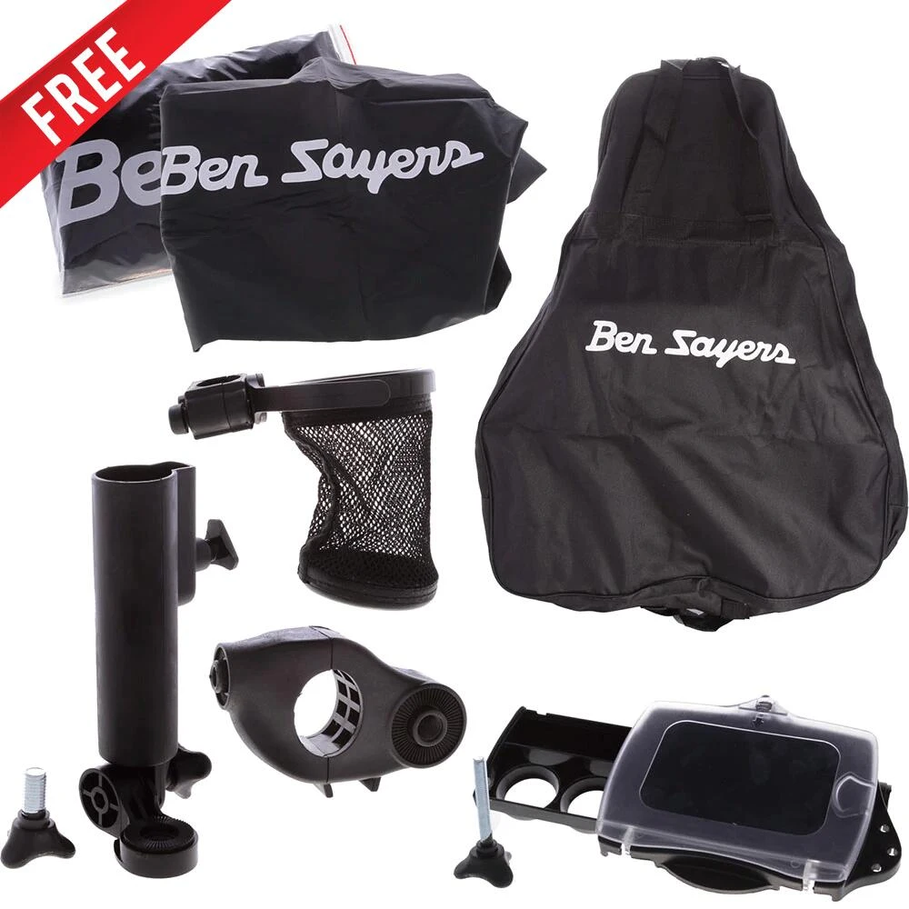 The Ben Sayers Lithium Electric golf trolley Features the very latest in on course tech Including a digital screen displaying speed and battery life. It also features an advanced digital distance function which allows you to to send your trolley 10, 20 or 30 metres. Whats more the trolley comes complete with a FREE accessory pack including an Umbrella holder, Drinks holder, Score card holder, Travel cover & rain cover all worth £149.99
