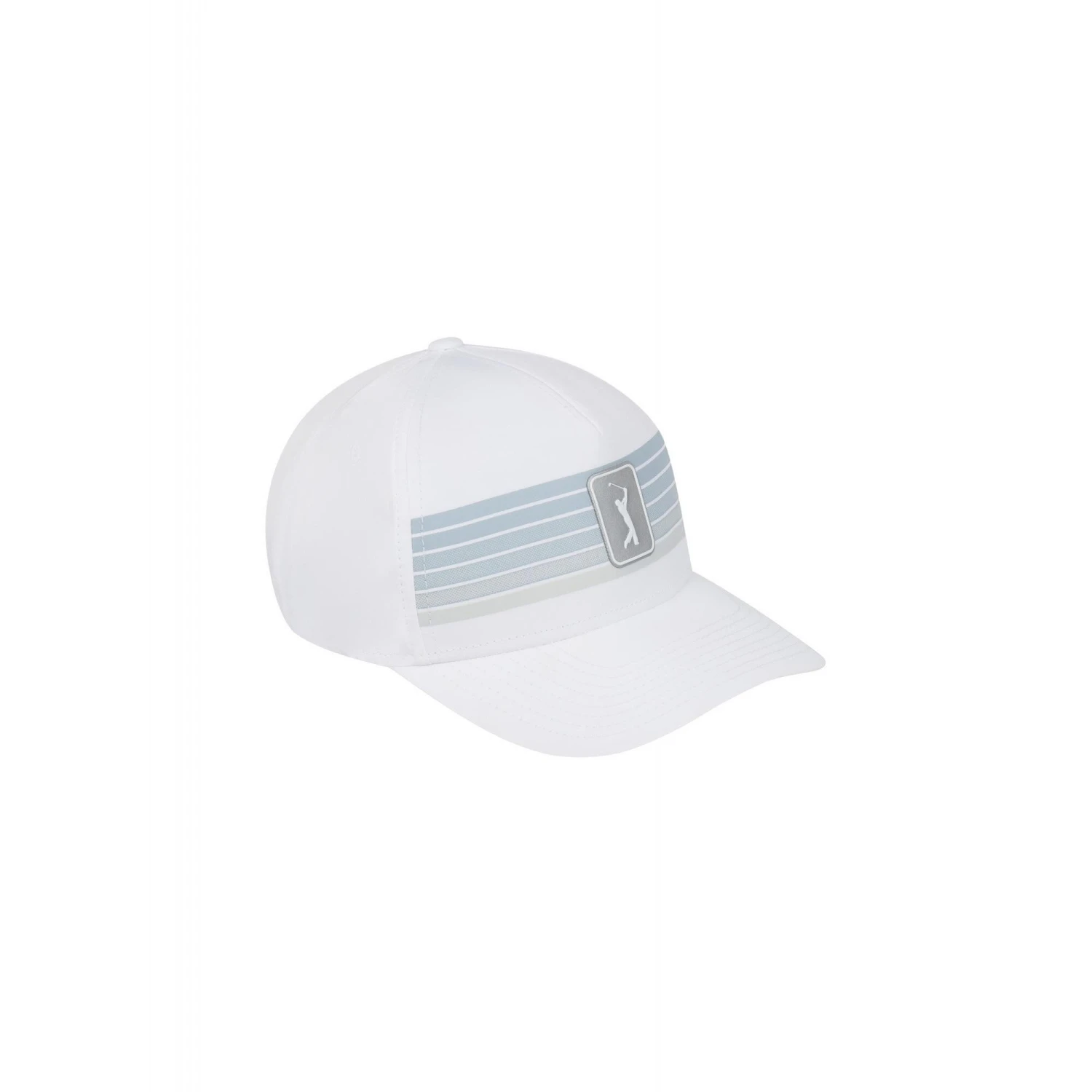 - Button at Top, Curved Brim, Panelled, Stitched Eyelets.
