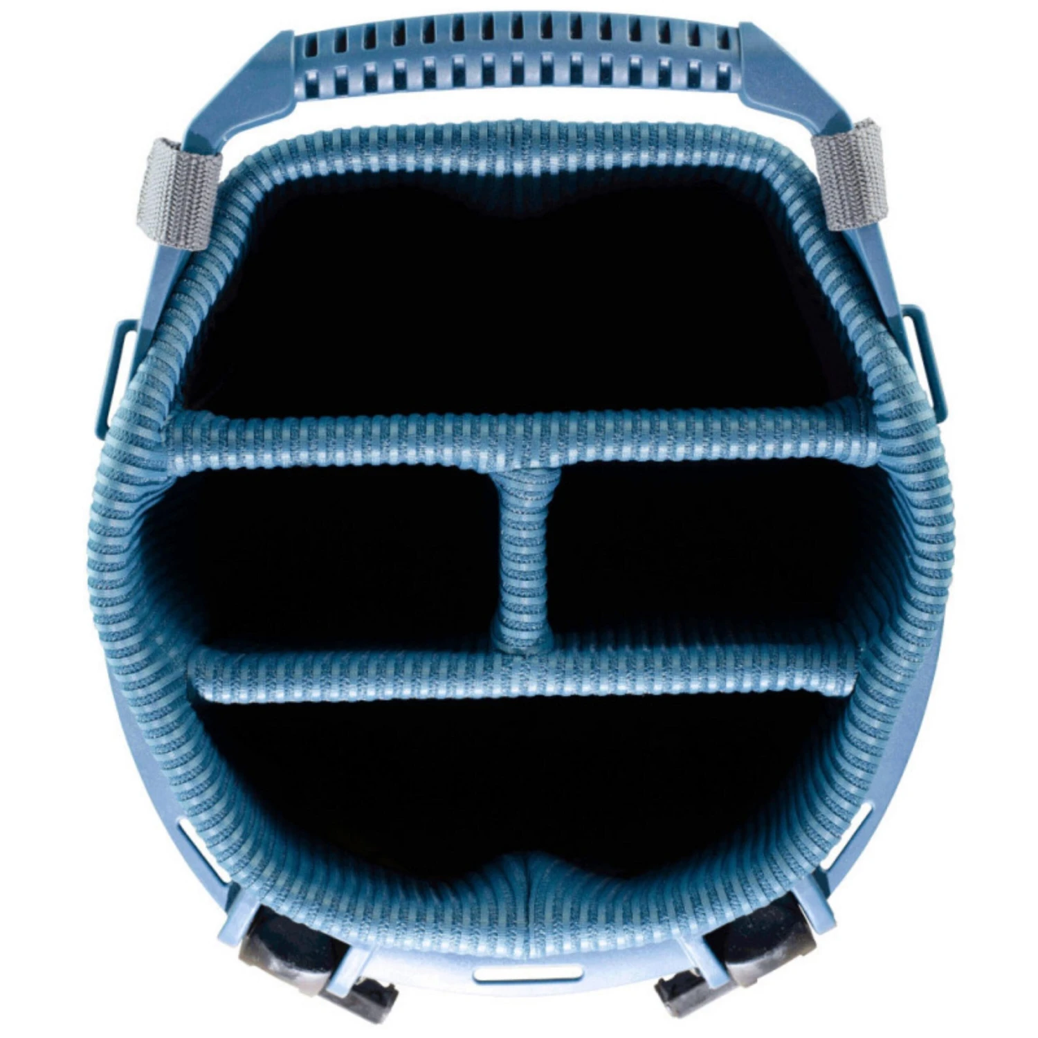 The Sun Mountain Eco-Lite Stand Bag is a golf bag made from recycled materials. It has a 4-way top with a comfort grip handle and full-length box dividers for easy club retrieval. The patented leg design features a roller bottom leg mechanism, and the bag is crafted with water-resistant Repreve® fabric made from recycled plastic bottles.