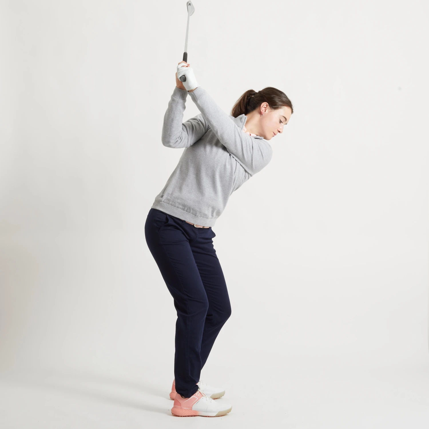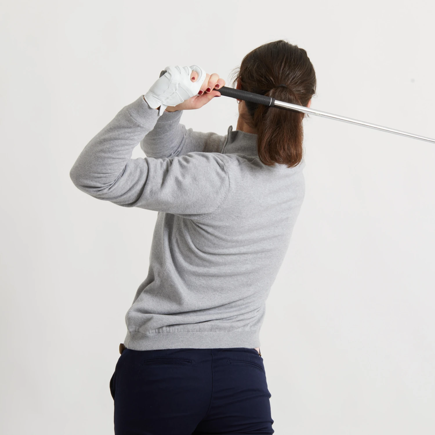 For example, the lining of the pullover is attached to the knitted exterior by invisible elastic bands for greater freedom of movement when turning the upper body in the upward and downward phases of the swing movement.